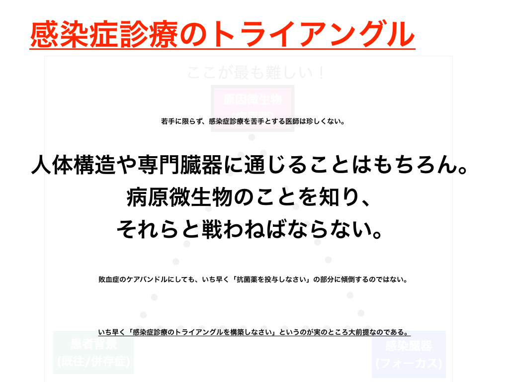 #5. 感染症診療のトライアングル 若手に限らず、感染症診療を苦手とする医師は珍しくない。 人体構造や専門臓器に通じることはもちろん。 病原微生物のことを知り、 それらと戦わねばならない。 敗血症のケアバンドルにしても、いち早く「抗菌薬を投与しなさい」の部分に傾倒するのではない。 いち早く「感染症診療のトライアングルを構築しなさい」というのが実のところ大前提なのである。