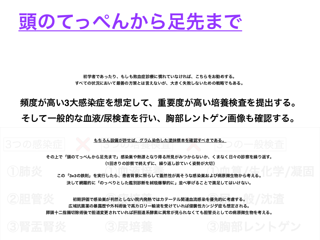 #6. 頭のてっぺんから足先まで 初学者であったり、もしも敗血症診療に慣れていなければ、こちらをお勧めする。 すべての状況において最善の方策とは言えないが、大きく失敗しないための戦略でもある。 頻度が高い3大感染症を想定して、重要度が高い培養検査を提出する。 そして一般的な血液/尿検査を行い、胸部レントゲン画像も確認する。 もちろん設備が許せば、グラム染色した塗抹標本を確認すべきである。 その上で「頭のてっぺんから足先まで」感染巣や熱源となり得る所見がみつからないか、くまなく日々の診察を繰り返す。 (1回きりの診察で終えずに、繰り返し診ていく姿勢が大切) この「3×3の鉄則」を実行したら、患者背景に照らして蓋然性が高そうな感染巣および病原微生物から考える。 決して網羅的に「のっぺりとした鑑別診断を絨毯爆撃的に」並べ挙げることで満足してはいけない。 初期評価で感染巣が判然としない院内発熱ではカテーテル関連血流感染を優先的に考慮する。 広域抗菌薬の暴露歴や外科術後で高カロリー輸液を受けていれば侵襲性カンジダ症も想定される。 膵頭十二指腸切除術後で胆道変更されていれば肝胆道系酵素に異常が見られなくても胆管炎としての病原微生物を考える。