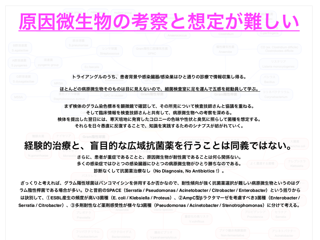#7. 原因微生物の考察と想定が難しい トライアングルのうち、患者背景や感染臓器/感染巣はひと通りの診療で情報収集し得る。 ほとんどの病原微生物そのものは目に見えないので、細菌検査室に足を運んで五感を総動員して学ぶ。 まず検体のグラム染色標本を顕微鏡で確認して、その所見について検査技師さんと協議を重ねる。 そして臨床情報を検査技師さんと共有して、病原微生物への考察を深める。 検体を提出した翌日には、寒天培地に発育したコロニーの色味や性状と臭気に照らして菌種を想定する。 それらを日々愚直に反復することで、知識を実践するためのシナプスが紡がれていく。 経験的治療と、盲目的な広域抗菌薬を行うことは同義ではない。 さらに、患者が重症であることと、原因微生物が耐性菌であることは何ら関係ない。 多くの感染症ではひとつの感染臓器にひとつの病原微生物がひとり勝ちなのである。 診断なくして抗菌薬治療なし(No Diagnosis, No Antibiotics !)。 ざっくりと考えれば、グラム陽性球菌はバンコマイシンを併用するか否かなので、耐性傾向が強く抗菌薬選択が難しい病原微生物というのはグ ラム陰性桿菌である場合が多い。ひと昔前のSPACE(Serratia / Pseudomonas / Acinetobacter / Citrobacter / Enterobacter)という括りから は訣別して、①ESBL産生の頻度が高い3菌種(E. coli / Klebsiella / Proteus)、②AmpC型βラクタマーゼを考慮すべき3菌種(Enterobacter / Serratia / Citrobacter)、③多剤耐性など薬剤感受性が様々な3菌種(Pseudomonas / Acinetobacter / Stenotrophomonas)に分けて考える。