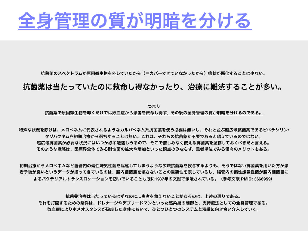 #8. 全身管理の質が明暗を分ける 抗菌薬のスペクトラムが原因微生物を外していたから(=カバーできていなかったから)病状が悪化することは少ない。 抗菌薬は当たっていたのに救命し得なかったり、治療に難渋することが多い。 つまり 抗菌薬で原因微生物を叩くだけでは敗血症から患者を救命し得ず、その後の全身管理の質が明暗を分けるのである。 特殊な状況を除けば、メロペネムに代表されるようなカルバペネム系抗菌薬を使う必要は無いし、それと並ぶ超広域抗菌薬であるピペラシリン/ タゾバクタムを初期治療から選択することは無い。これは、それらの抗菌薬が不要であると唱えているのではない。 超広域抗菌薬が必要な状況にはいつか必ず遭遇しうるので、そこで惜しみなく使える抗菌薬を温存しておくべきだと言える。 そのような戦略は、医療界全体でみる耐性菌の拡大や増加といった観点のみならず、患者単位でみる個々のメリットもある。 初期治療からメロペネムなど腸管内の偏性嫌気性菌を駆逐してしまうような広域抗菌薬を投与するよりも、そうではない抗菌薬を用いた方が患 者予後が良いというデータが揃ってきているのは、腸内細菌叢を壊さないことの重要性を表しているし、腸管内の偏性嫌気性菌が腸内細菌目に よるバクテリアルトランスロケーションを防いでいることも既に1987年の文献で示唆されている。(参考文献 PMID: 3666959) 抗菌薬治療は当たっているはずなのに…患者を救えないことがあるのは、上述の通りである。 それを打開するための条件は、ドレナージやデブリードマンといった感染巣の制御と、支持療法としての全身管理である。 敗血症によりホメオスタシスが破綻した身体において、ひとつひとつのシステムと精緻に向き合い介入していく。