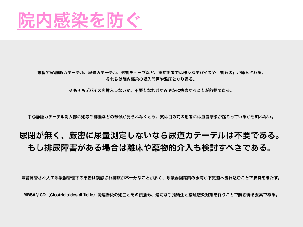#9. 院内感染を防ぐ 末梢/中心静脈カテーテル、尿道カテーテル、気管チューブなど、重症患者では様々なデバイスや「管もの」が挿入される。 それらは院内感染の侵入門戸や温床となり得る。 そもそもデバイスを挿入しないか、不要となればすみやかに抜去することが前提である。 中心静脈カテーテル刺入部に発赤や排膿などの徴候が見られなくとも、実は目の前の患者には血流感染が起こっているかも知れない。 尿閉が無く、厳密に尿量測定しないなら尿道カテーテルは不要である。 もし排尿障害がある場合は離床や薬物的介入も検討すべきである。 気管挿管され人工呼吸器管理下の患者は鎮静され排痰が不十分なことが多く、呼吸器回路内の水滴が下気道へ流れ込むことで肺炎をきたす。 fi MRSAやCD(Clostridioides dif cile)関連腸炎の発症とその伝播も、適切な手指衛生と接触感染対策を行うことで防ぎ得る要素である。