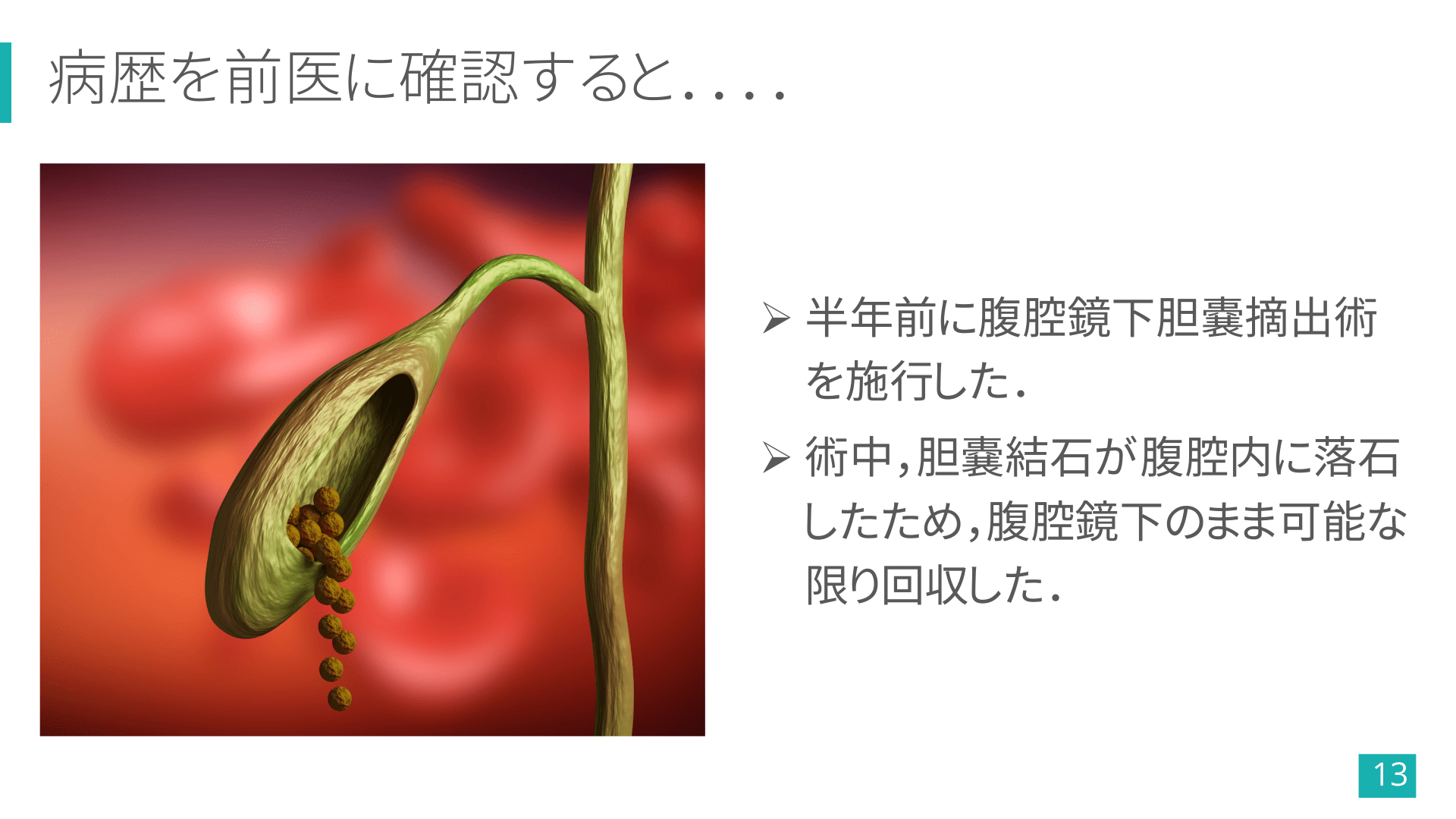 #13. 病歴を前医に確認すると.... Ø 半年前に腹腔鏡下胆嚢摘出術 を施行した. Ø 術中,胆嚢結石が腹腔内に落石 したため,腹腔鏡下のまま可能な 限り回収した. 13