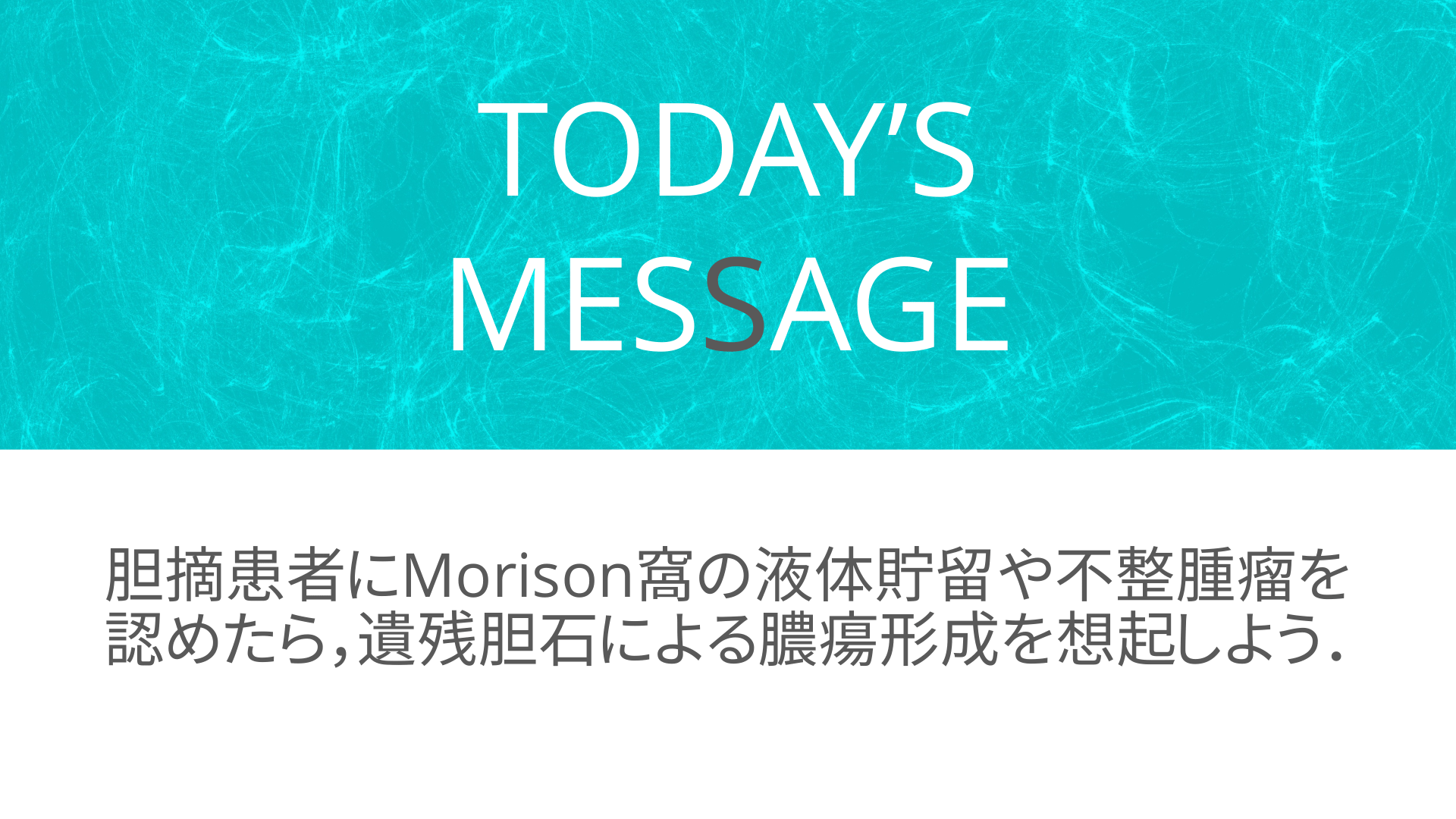 #33. TODAY’S MESSAGE 胆摘患者にMorison窩の液体貯留や不整腫瘤を 認めたら,遺残胆石による膿瘍形成を想起しよう.