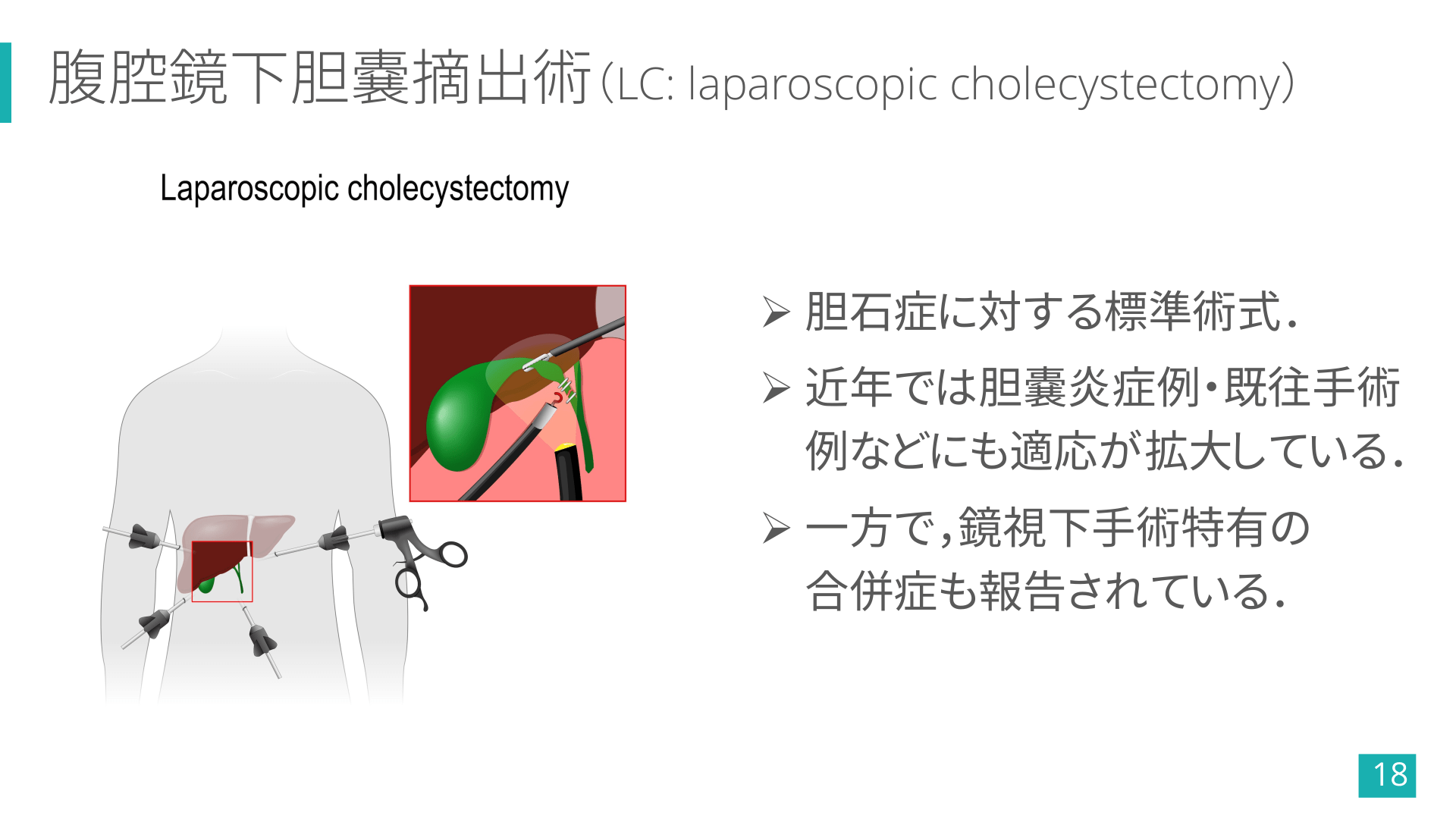 #18. 腹腔鏡下胆嚢摘出術(LC: laparoscopic cholecystectomy) Ø 胆石症に対する標準術式. Ø 近年では胆嚢炎症例・既往手術 例などにも適応が拡大している. Ø 一方で,鏡視下手術特有の 合併症も報告されている. 18