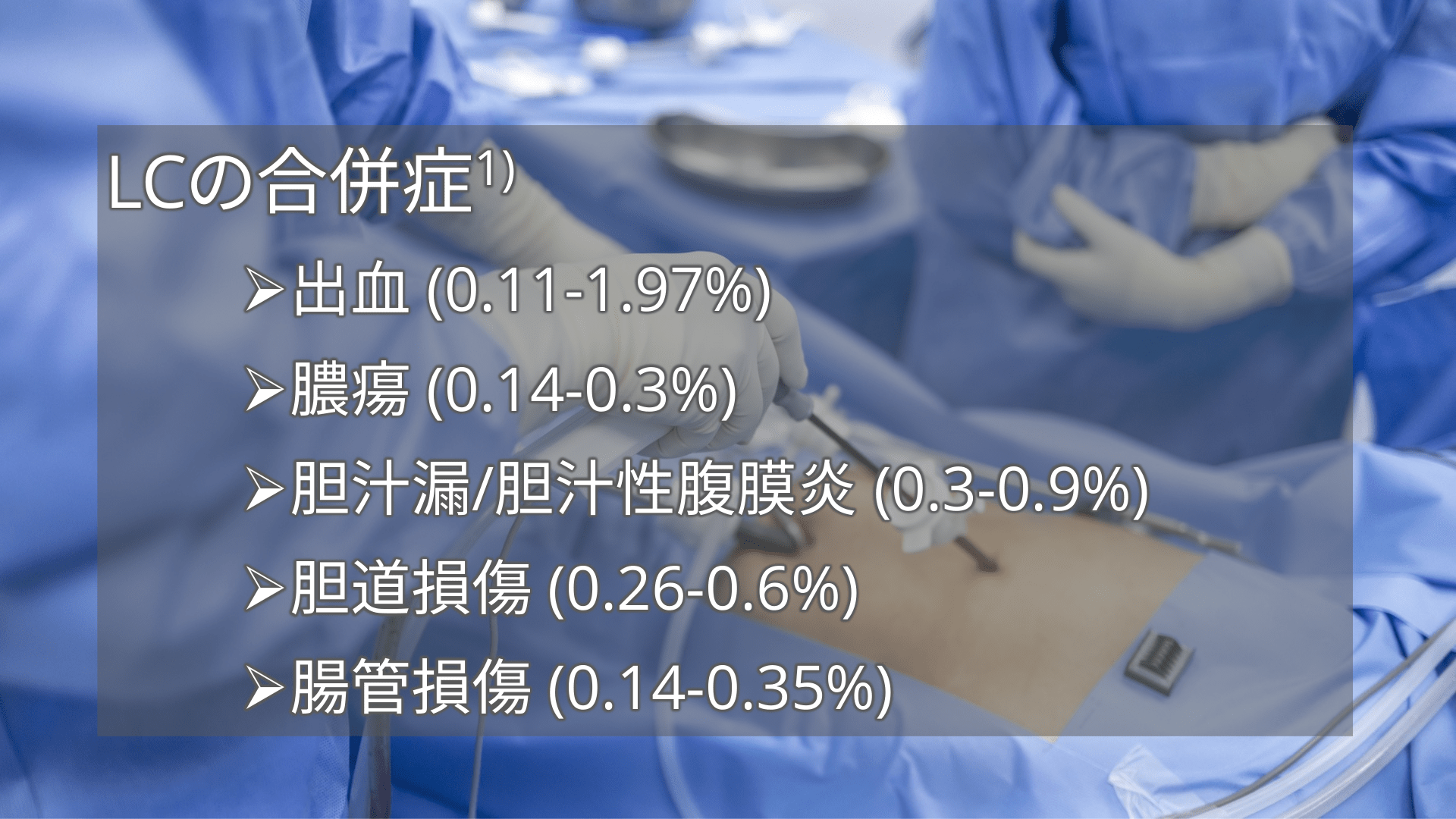 #19. 1) LCの合併症 Ø出血 (0.11-1.97%) Ø膿瘍 (0.14-0.3%) Ø胆汁漏/胆汁性腹膜炎 (0.3-0.9%) Ø胆道損傷 (0.26-0.6%) Ø腸管損傷 (0.14-0.35%)