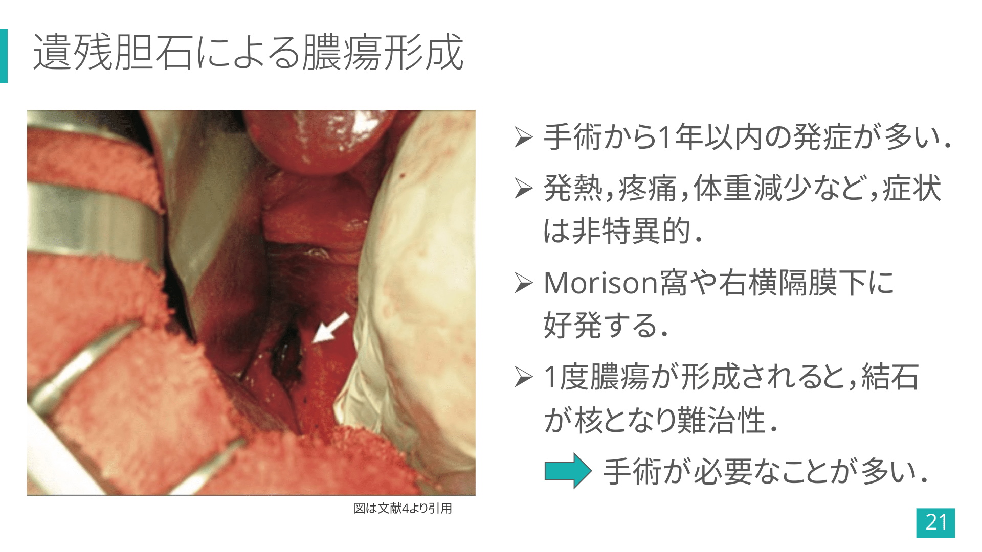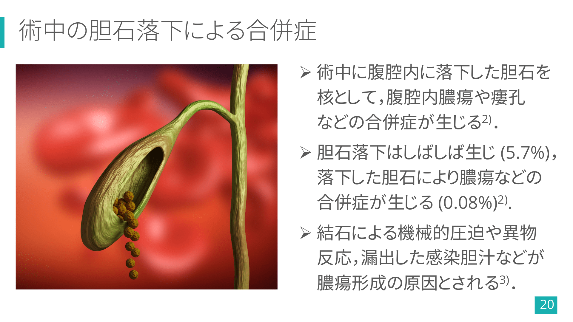 #20. 術中の胆石落下による合併症 Ø 術中に腹腔内に落下した胆石を 核として,腹腔内膿瘍や瘻孔 などの合併症が生じる2). Ø 胆石落下はしばしば生じ (5.7%), 落下した胆石により膿瘍などの 合併症が生じる (0.08%)2). Ø 結石による機械的圧迫や異物 反応,漏出した感染胆汁などが 膿瘍形成の原因とされる3). 20