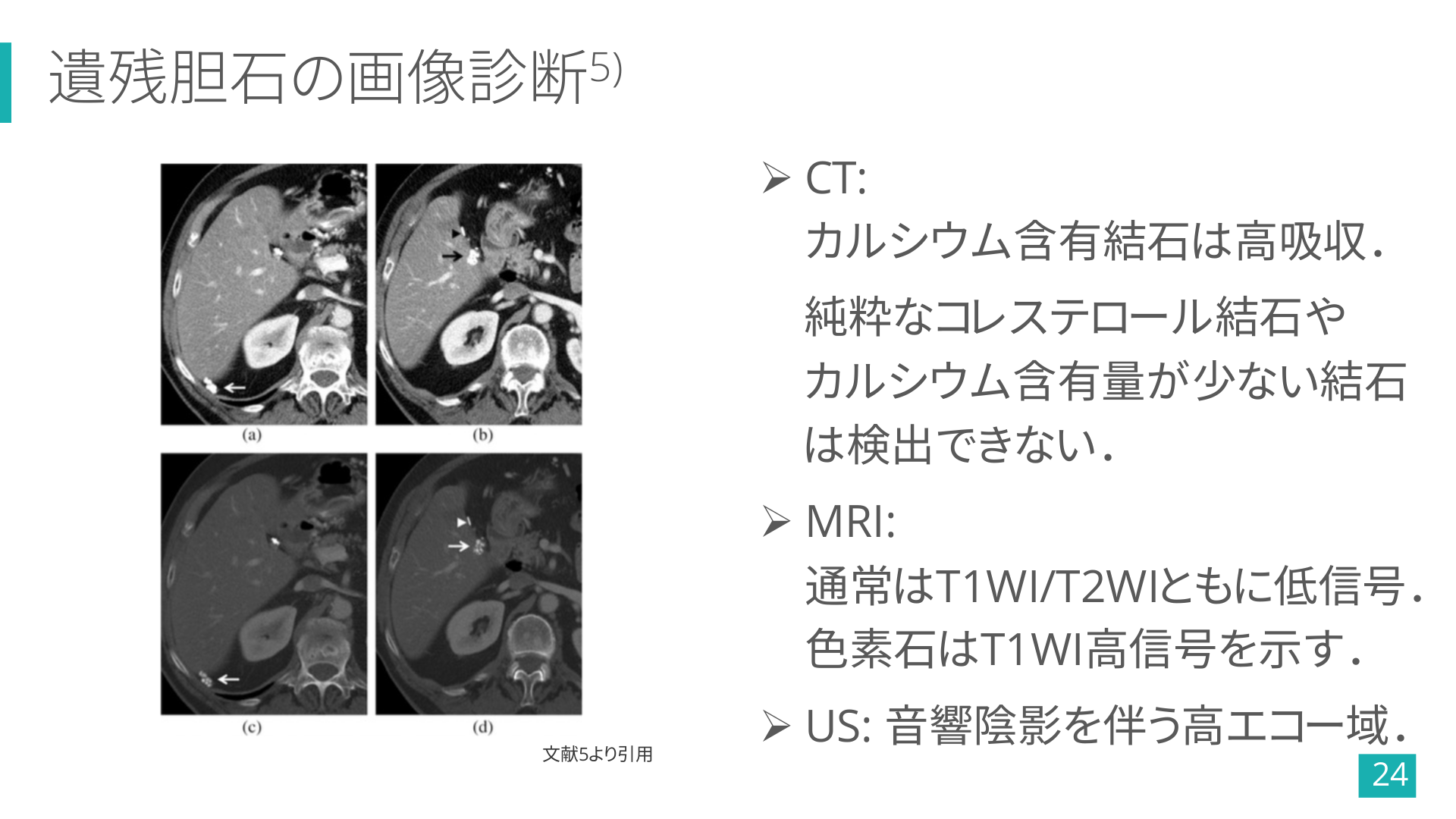 #24. 5) 遺残胆石の画像診断 Ø CT: カルシウム含有結石は高吸収. 純粋なコレステロール結石や カルシウム含有量が少ない結石 は検出できない. Ø MRI: 通常はT1WI/T2WIともに低信号. 色素石はT1WI高信号を示す. 文献5より引用 Ø US: 音響陰影を伴う高エコー域. 24