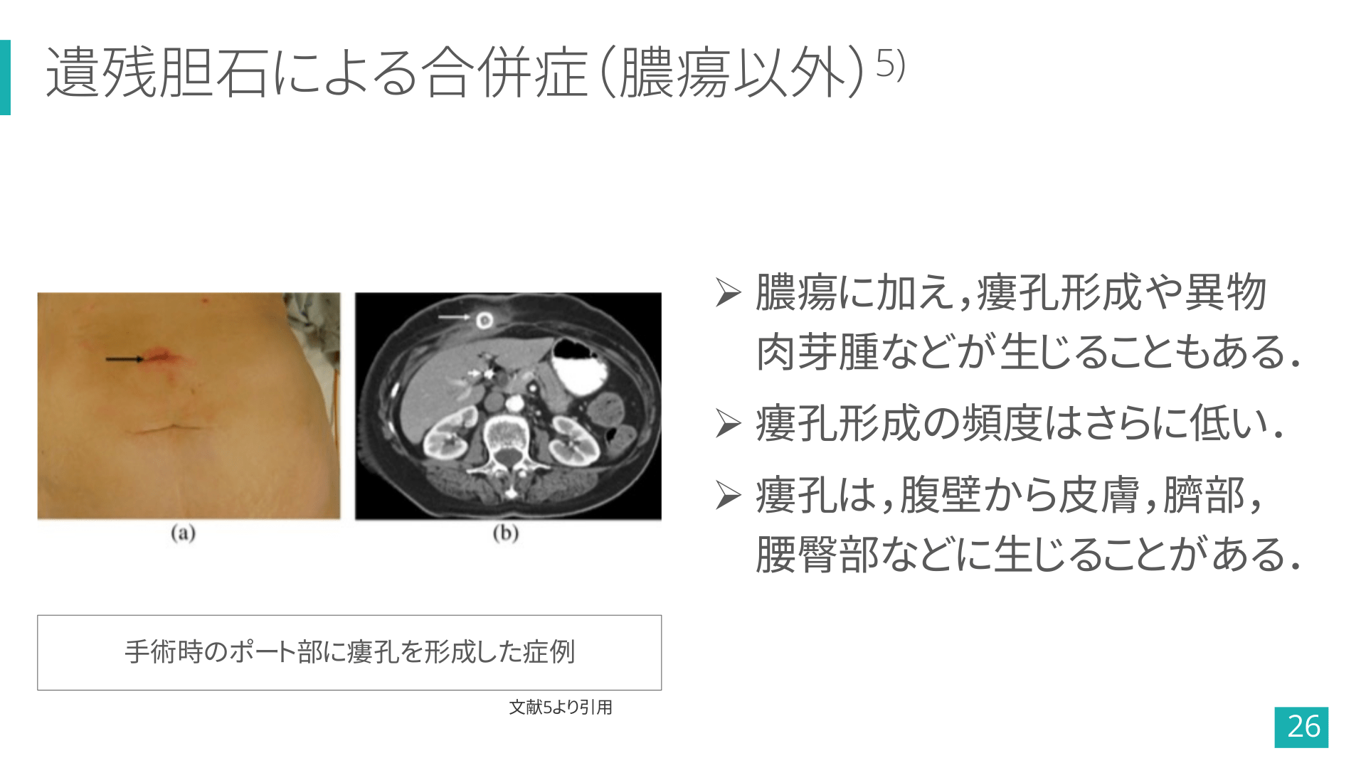 #26. 5) 遺残胆石による合併症(膿瘍以外) Ø 膿瘍に加え,瘻孔形成や異物 肉芽腫などが生じることもある. Ø 瘻孔形成の頻度はさらに低い. Ø 瘻孔は,腹壁から皮膚,臍部, 腰臀部などに生じることがある. 手術時のポート部に瘻孔を形成した症例 文献5より引用 26
