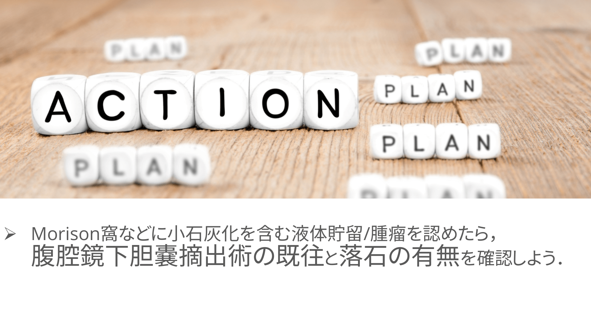 #34. Ø Morison窩などに小石灰化を含む液体貯留/腫瘤を認めたら, 腹腔鏡下胆嚢摘出術の既往と落石の有無を確認しよう.