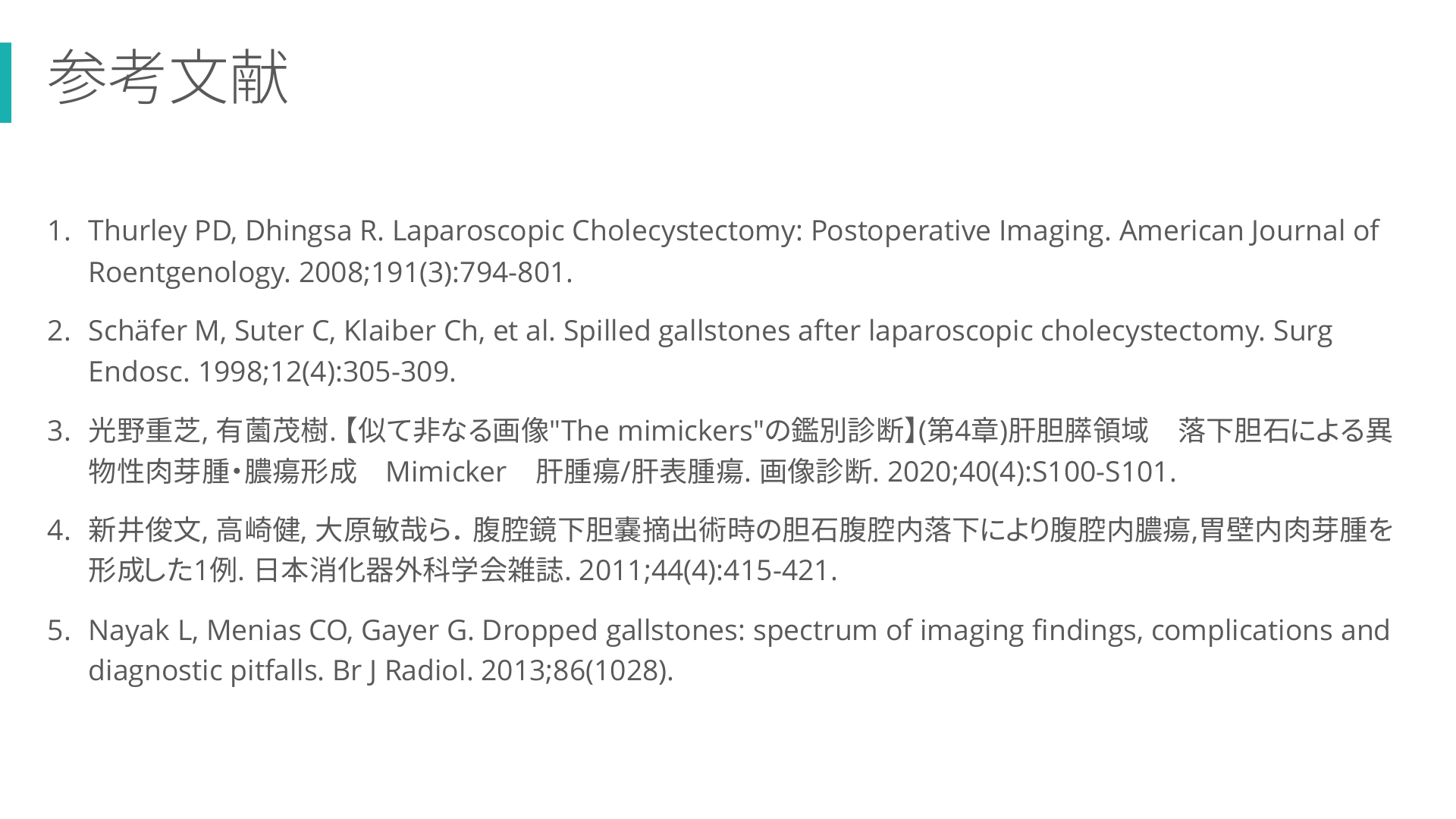 #35. 参考文献 1. Thurley PD, Dhingsa R. Laparoscopic Cholecystectomy: Postoperative Imaging. American Journal of Roentgenology. 2008;191(3):794-801. 2. Schäfer M, Suter C, Klaiber Ch, et al. Spilled gallstones after laparoscopic cholecystectomy. Surg Endosc. 1998;12(4):305-309. 3. 光野重芝, 有薗茂樹. 【似て非なる画像"The mimickers"の鑑別診断】(第4章)肝胆膵領域 落下胆石による異 物性肉芽腫・膿瘍形成 Mimicker 肝腫瘍/肝表腫瘍. 画像診断. 2020;40(4):S100-S101. 4. 新井俊文, 高崎健, 大原敏哉ら. 腹腔鏡下胆嚢摘出術時の胆石腹腔内落下により腹腔内膿瘍,胃壁内肉芽腫を 形成した1例. 日本消化器外科学会雑誌. 2011;44(4):415-421. 5. Nayak L, Menias CO, Gayer G. Dropped gallstones: spectrum of imaging findings, complications and diagnostic pitfalls. Br J Radiol. 2013;86(1028).
