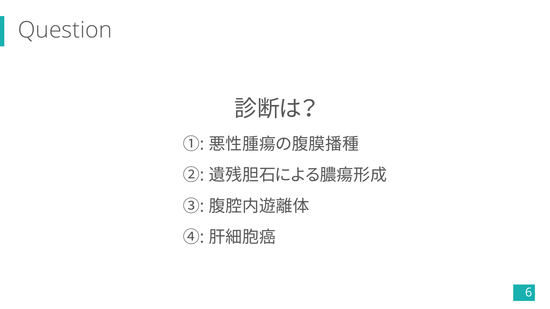 #6. Question 診断は? ①: 悪性腫瘍の腹膜播種 ②: 遺残胆石による膿瘍形成 ③: 腹腔内遊離体 ④: 肝細胞癌 6