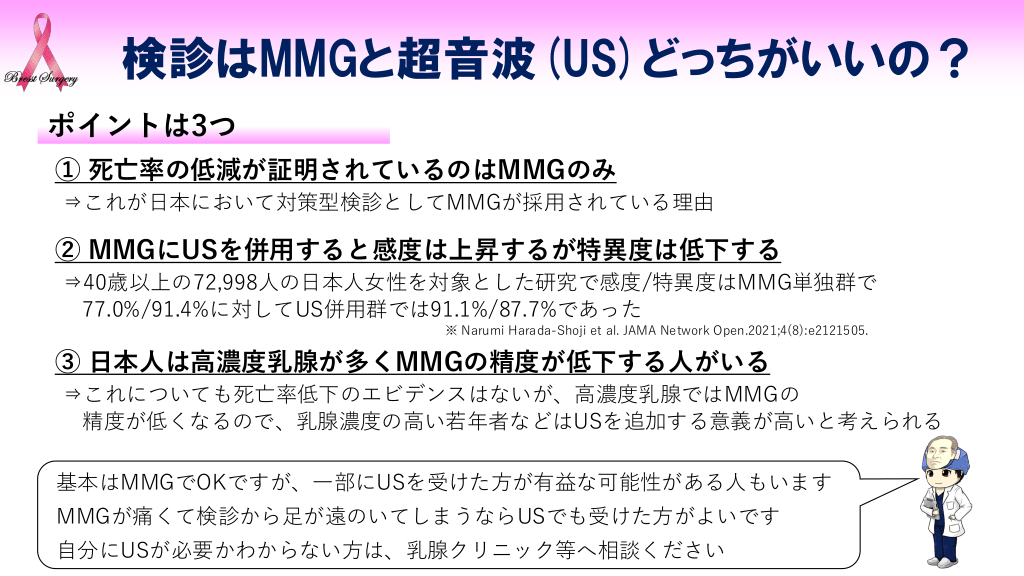 #10. 検診はMMGと超音波(US)どっちがいいの? ポイントは3つ ① 死亡率の低減が証明されているのはMMGのみ ⇒これが日本において対策型検診としてMMGが採用されている理由 ② MMGにUSを併用すると感度は上昇するが特異度は低下する ⇒40歳以上の72,998人の日本人女性を対象とした研究で感度/特異度はMMG単独群で 77.0%/91.4%に対してUS併用群では91.1%/87.7%であった ※ Narumi Harada-Shoji et al. JAMA Network Open.2021;4(8):e2121505. ③ 日本人は高濃度乳腺が多くMMGの精度が低下する人がいる ⇒これについても死亡率低下のエビデンスはないが、高濃度乳腺ではMMGの 精度が低くなるので、乳腺濃度の高い若年者などはUSを追加する意義が高いと考えられる 基本はMMGでOKですが、一部にUSを受けた方が有益な可能性がある人もいます MMGが痛くて検診から足が遠のいてしまうならUSでも受けた方がよいです 自分にUSが必要かわからない方は、乳腺クリニック等へ相談ください