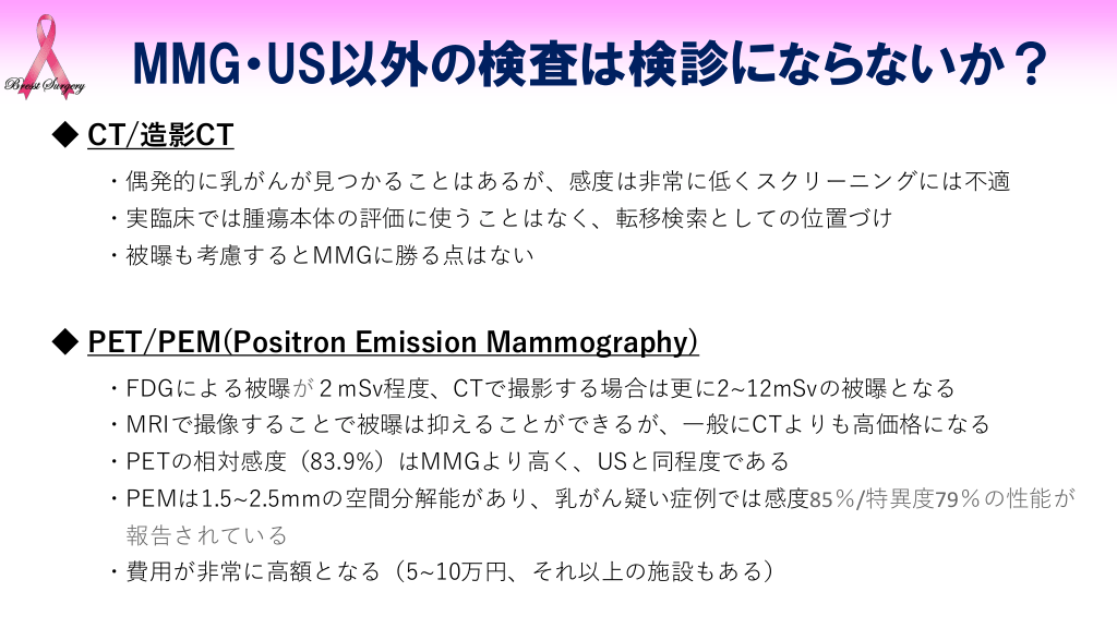 #11. MMG・US以外の検査は検診にならないか? ◆ CT/造影CT ・偶発的に乳がんが見つかることはあるが、感度は非常に低くスクリーニングには不適 ・実臨床では腫瘍本体の評価に使うことはなく、転移検索としての位置づけ ・被曝も考慮するとMMGに勝る点はない ◆ PET/PEM(Positron Emission Mammography) ・FDGによる被曝が2mSv程度、CTで撮影する場合は更に2~12mSvの被曝となる ・MRIで撮像することで被曝は抑えることができるが、一般にCTよりも高価格になる ・PETの相対感度(83.9%)はMMGより高く、USと同程度である ・PEMは1.5~2.5mmの空間分解能があり、乳がん疑い症例では感度85%/特異度79%の性能が 報告されている ・費用が非常に高額となる(5~10万円、それ以上の施設もある)