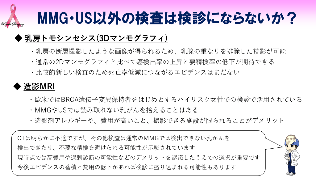 #12. MMG・US以外の検査は検診にならないか? ◆ 乳房トモシンセシス(3Dマンモグラフィ) ・乳房の断層撮影したような画像が得られるため、乳腺の重なりを排除した読影が可能 ・通常の2Dマンモグラフィと比べて癌検出率の上昇と要精検率の低下が期待できる ・比較的新しい検査のため死亡率低減につながるエビデンスはまだない ◆ 造影MRI ・欧米ではBRCA遺伝子変異保持者をはじめとするハイリスク女性での検診で活用されている ・MMGやUSでは読み取れない乳がんを拾えることはある ・造影剤アレルギーや、費用が高いこと、撮影できる施設が限られることがデメリット CTは明らかに不適ですが、その他検査は通常のMMGでは検出できない乳がんを 検出できたり、不要な精検を避けられる可能性が示唆されています 現時点では高費用や過剰診断の可能性などのデメリットを認識したうえでの選択が重要です 今後エビデンスの蓄積と費用の低下があれば検診に盛り込まれる可能性もあります
