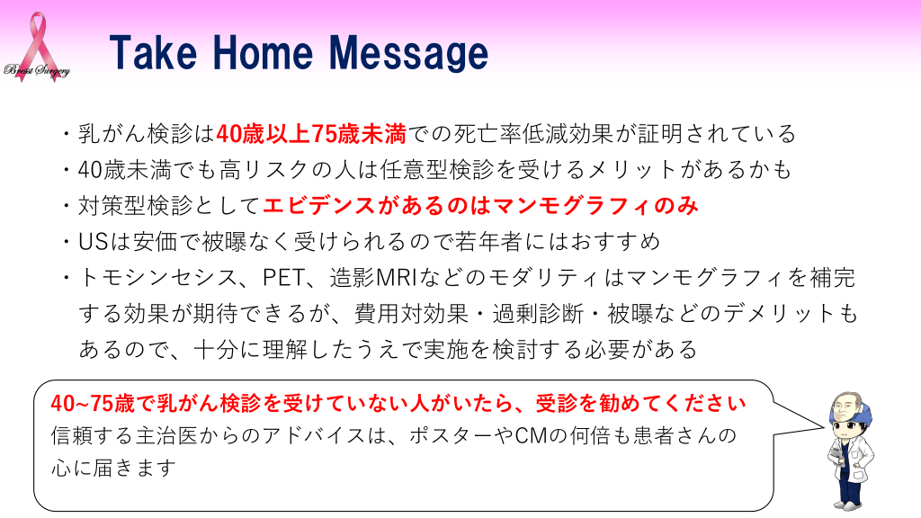 #13. Take Home Message ・乳がん検診は40歳以上75歳未満での死亡率低減効果が証明されている ・40歳未満でも高リスクの人は任意型検診を受けるメリットがあるかも ・対策型検診としてエビデンスがあるのはマンモグラフィのみ ・USは安価で被曝なく受けられるので若年者にはおすすめ ・トモシンセシス、PET、造影MRIなどのモダリティはマンモグラフィを補完 する効果が期待できるが、費用対効果・過剰診断・被曝などのデメリットも あるので、十分に理解したうえで実施を検討する必要がある 40~75歳で乳がん検診を受けていない人がいたら、受診を勧めてください 信頼する主治医からのアドバイスは、ポスターやCMの何倍も患者さんの 心に届きます