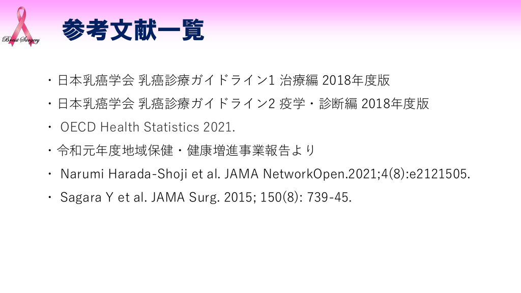 #14. 参考文献一覧 ・日本乳癌学会 乳癌診療ガイドライン1 治療編 2018年度版 ・日本乳癌学会 乳癌診療ガイドライン2 疫学・診断編 2018年度版 ・ OECD Health Statistics 2021. ・令和元年度地域保健・健康増進事業報告より ・ Narumi Harada-Shoji et al. JAMA NetworkOpen.2021;4(8):e2121505. ・ Sagara Y et al. JAMA Surg. 2015; 150(8): 739-45.