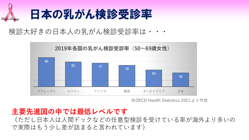 #4. 日本の乳がん検診受診率 検診大好きの日本人の乳がん検診受診率は・・・ 2019年各国の乳がん検診受診率(50~69歳女性) 95 81 77 70 55 スウェーデン スペイン アメリカ 韓国 オーストラリア 45 日本 ※OECD Health Statistics 2021.より作成 主要先進国の中では最低レベルです (ただし日本人は人間ドックなどの任意型検診を受けている率が海外より多いの で実際はもう少し差が詰まると言われています)