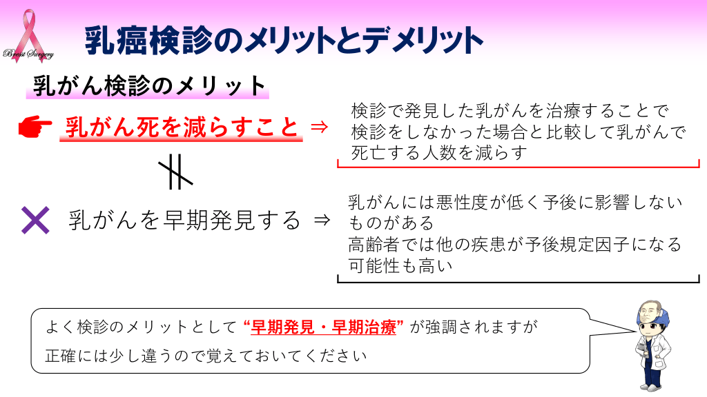 #5. 乳癌検診のメリットとデメリット 乳がん検診のメリット 乳がん死を減らすこと ⇒ 乳がんを早期発見する ⇒ 検診で発見した乳がんを治療することで 検診をしなかった場合と比較して乳がんで 死亡する人数を減らす 乳がんには悪性度が低く予後に影響しない ものがある 高齢者では他の疾患が予後規定因子になる 可能性も高い よく検診のメリットとして “早期発見・早期治療” が強調されますが 正確には少し違うので覚えておいてください