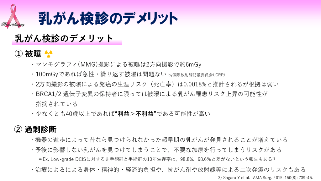 #6. 乳がん検診のデメリット 乳がん検診のデメリット ① 被曝 ・マンモグラフィ(MMG)撮影による被曝は2方向撮影で約6mGy ・100mGyであれば急性・繰り返す被曝は問題ない by国際放射線防護委員会(ICRP) ・2方向撮影の被曝による発癌の生涯リスク(死亡率)は0.0018%と推計されるが根拠は弱い ・BRCA1/2 遺伝子変異の保持者に限っては被曝による乳がん罹患リスク上昇の可能性が 指摘されている ・少なくとも40歳以上であれば“利益>不利益”である可能性が高い ② 過剰診断 ・機器の進歩によって昔なら見つけられなかった超早期の乳がんが発見されることが増えている ・予後に影響しない乳がんを見つけてしまうことで、不要な加療を行ってしまうリスクがある ⇒Ex. Low-grade DCISに対する非手術群と手術群の10年生存率は、98.8%、98.6%と差がないという報告もある)3 ・治療によるによる身体・精神的・経済的負担や、抗がん剤や放射線等による二次発癌のリスクもある 3) Sagara Y et al. JAMA Surg. 2015; 150(8): 739-45.
