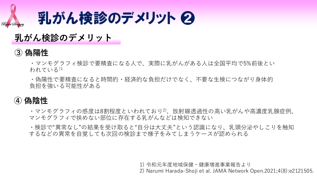 #7. 乳がん検診のデメリット ➋ 乳がん検診のデメリット ③ 偽陽性 ・マンモグラフィ検診で要精査になる人で、実際に乳がんがある人は全国平均で5%前後とい われている)1 ・偽陽性で要精査になると時間的・経済的な負担だけでなく、不要な生検につながり身体的 負担を強いる可能性がある ④ 偽陰性 ・マンモグラフィの感度は8割程度といわれており2)、放射線透過性の高い乳がんや高濃度乳腺症例、 マンモグラフィで挟めない部位に存在する乳がんなどは検知できない ・検診で“異常なし”の結果を受け取ると“自分は大丈夫”という認識になり、乳頭分泌やしこりを触知 するなどの異常を自覚しても次回の検診まで様子をみてしまうケースが認められる 1) 令和元年度地域保健・健康増進事業報告より 2) Narumi Harada-Shoji et al. JAMA Network Open.2021;4(8):e2121505.