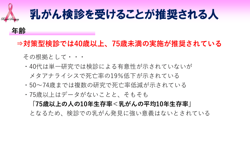 #8. 乳がん検診を受けることが推奨される人 年齢 ⇒対策型検診では40歳以上、75歳未満の実施が推奨されている その根拠として・・・ ・40代は単一研究では検診による有意性が示されていないが メタアナライシスで死亡率の19%低下が示されている ・50~74歳までは複数の研究で死亡率低減が示されている ・75歳以上はデータがないことと、そもそも 「75歳以上の人の10年生存率<乳がんの平均10年生存率」 となるため、検診での乳がん発見に強い意義はないとされている