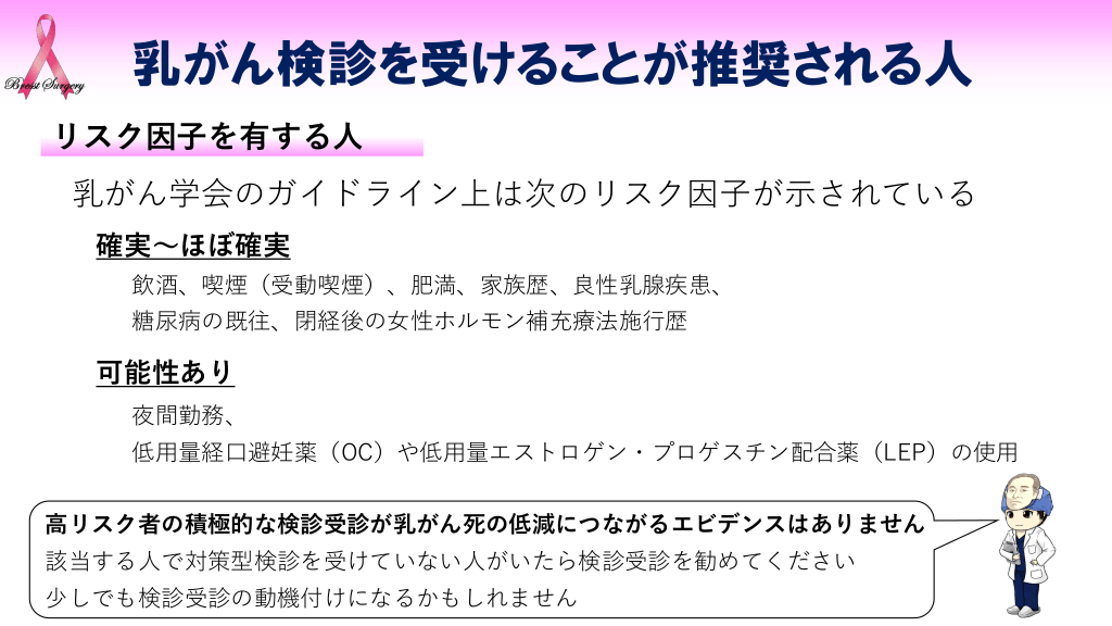 #9. 乳がん検診を受けることが推奨される人 リスク因子を有する人 乳がん学会のガイドライン上は次のリスク因子が示されている 確実~ほぼ確実 飲酒、喫煙(受動喫煙)、肥満、家族歴、良性乳腺疾患、 糖尿病の既往、閉経後の女性ホルモン補充療法施行歴 可能性あり 夜間勤務、 低用量経口避妊薬(OC)や低用量エストロゲン・プロゲスチン配合薬(LEP)の使用 高リスク者の積極的な検診受診が乳がん死の低減につながるエビデンスはありません 該当する人で対策型検診を受けていない人がいたら検診受診を勧めてください 少しでも検診受診の動機付けになるかもしれません