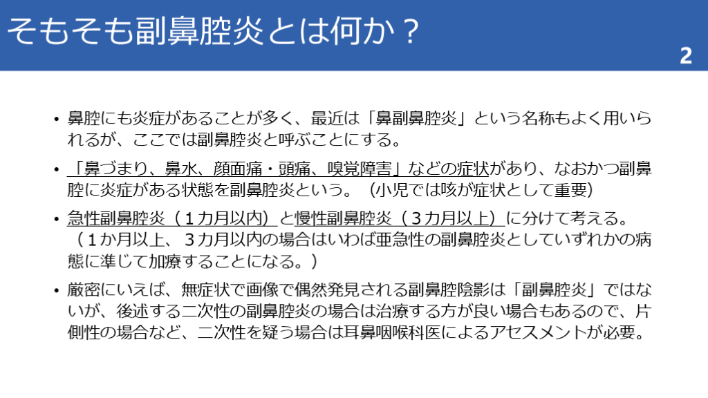 また、近年増えている好酸球性副鼻腔炎についても適切に治療を行う必要があります。再発時の対応も含めて耳鼻咽喉科医からジェネラリストまで幅広い先生方を対象とした網羅的なスライドになっていますので是非ご覧ください。