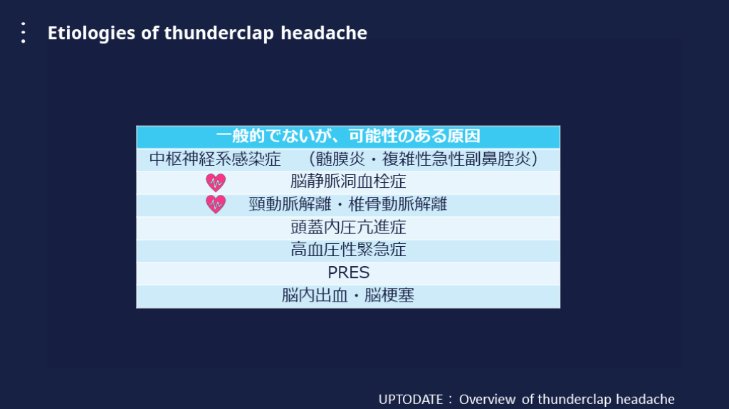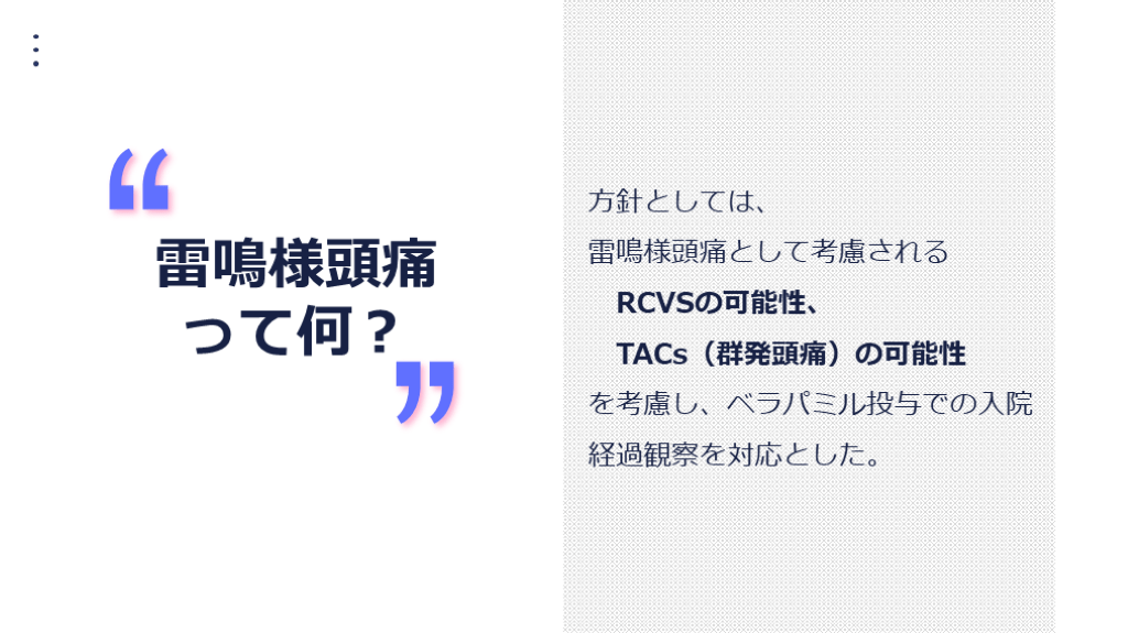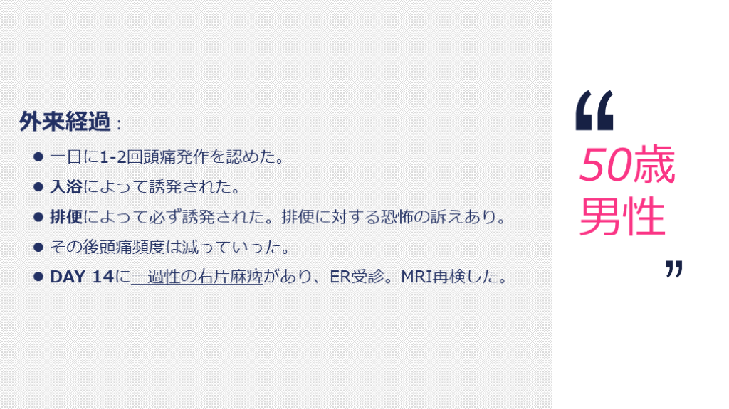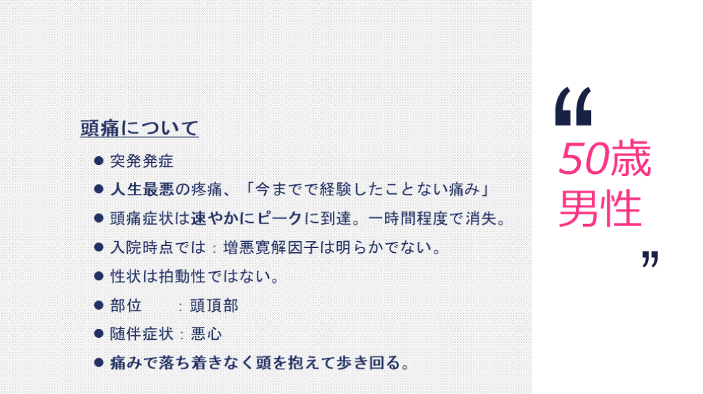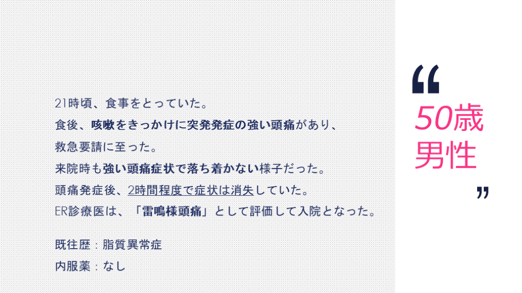 ER診療医は、「雷鳴様頭痛」として評価して入院となった。