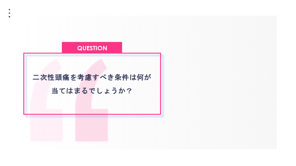 #5. 二次性頭痛を考慮すべき条件は何が当てはまるでしょうか? QUESTION