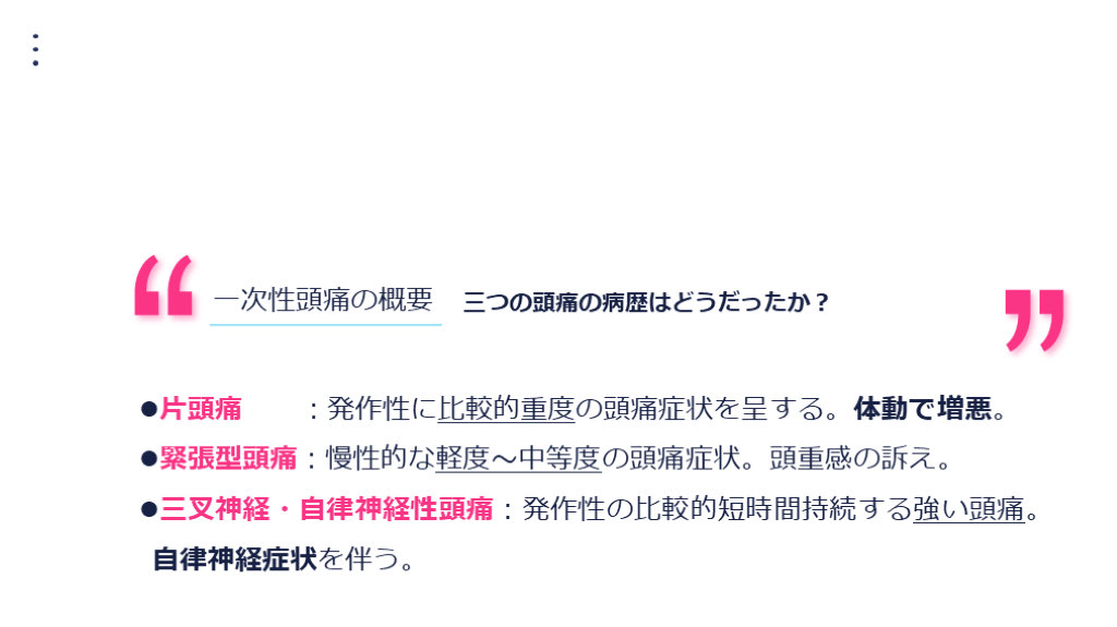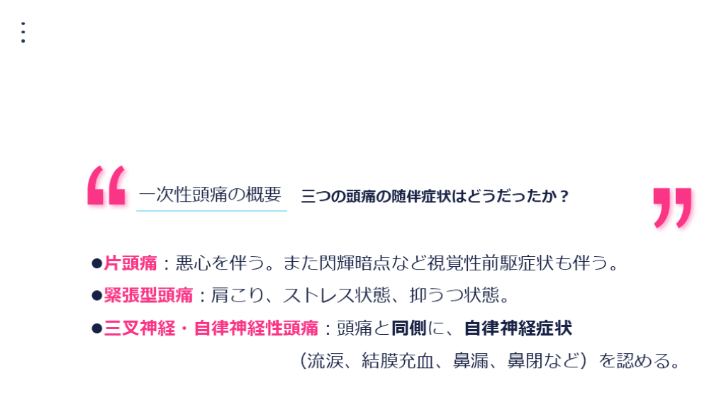 #9. 一次性頭痛の概要 三つの頭痛の随伴症状はどうだったか? 片頭痛:悪心を伴う。また閃輝暗点など視覚性前駆症状も伴う。