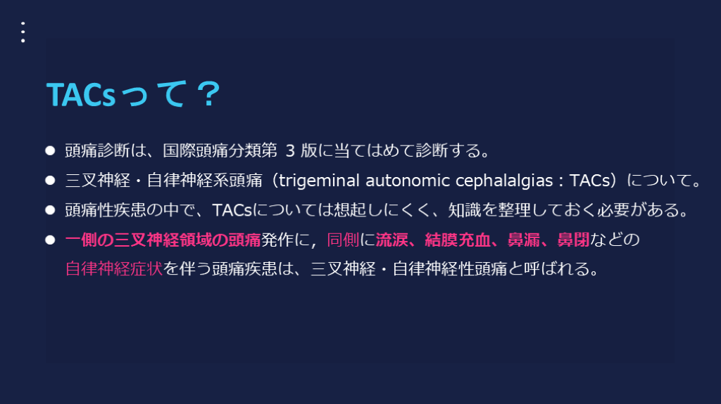 三叉神経・自律神経系頭痛(trigeminal autonomic cephalalgias:TACs)について。