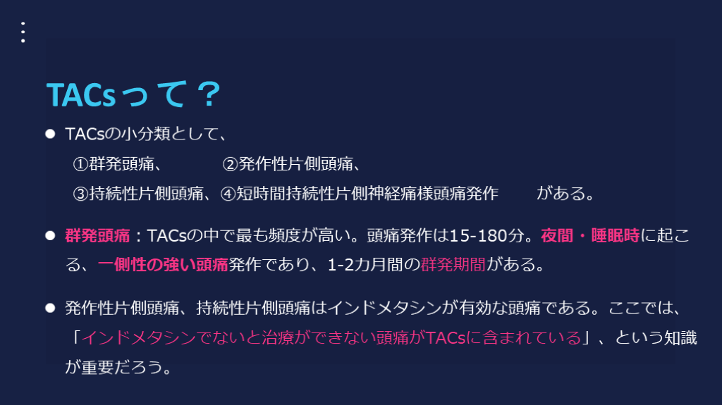 発作性片側頭痛、持続性片側頭痛はインドメタシンが有効な頭痛である。ここでは、「インドメタシンでないと治療ができない頭痛がTACsに含まれている」、という知識が重要だろう。 TACsって?