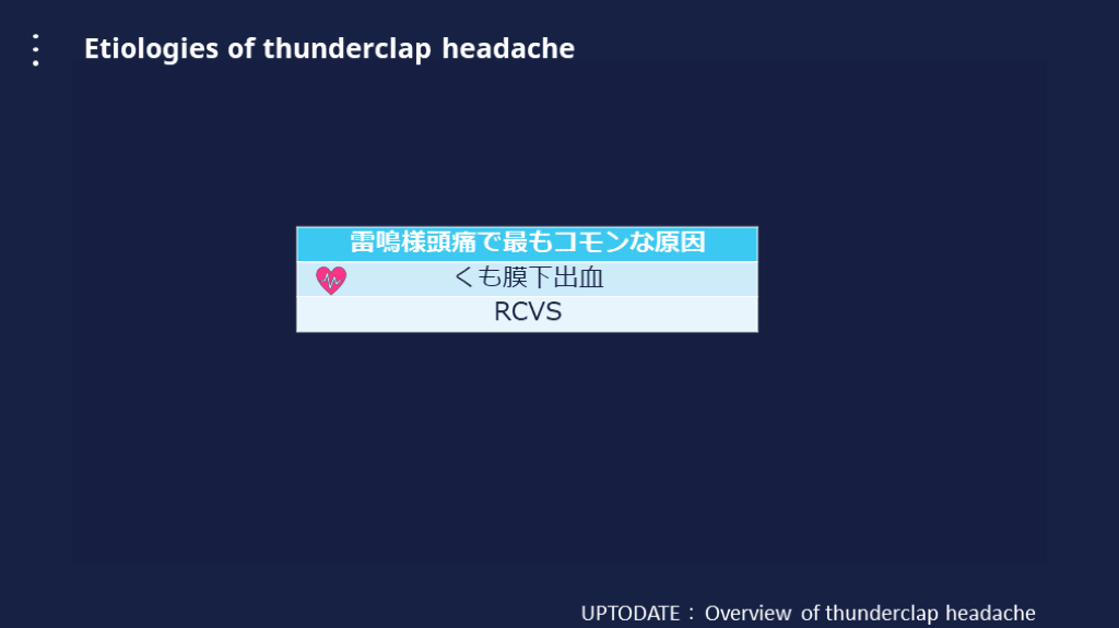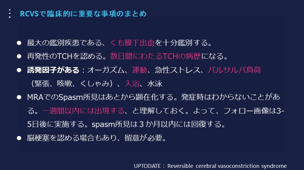 #33. UPTODATE:Reversible cerebral vasoconstriction syndrome RCVSで臨床的に重要な事項のまとめ 最大の鑑別疾患である、くも膜下出血を十分鑑別する。