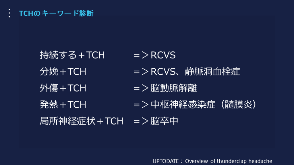 #31. UPTODATE:Overview of thunderclap headache TCHのキーワード診断 持続する+TCH =>RCVS