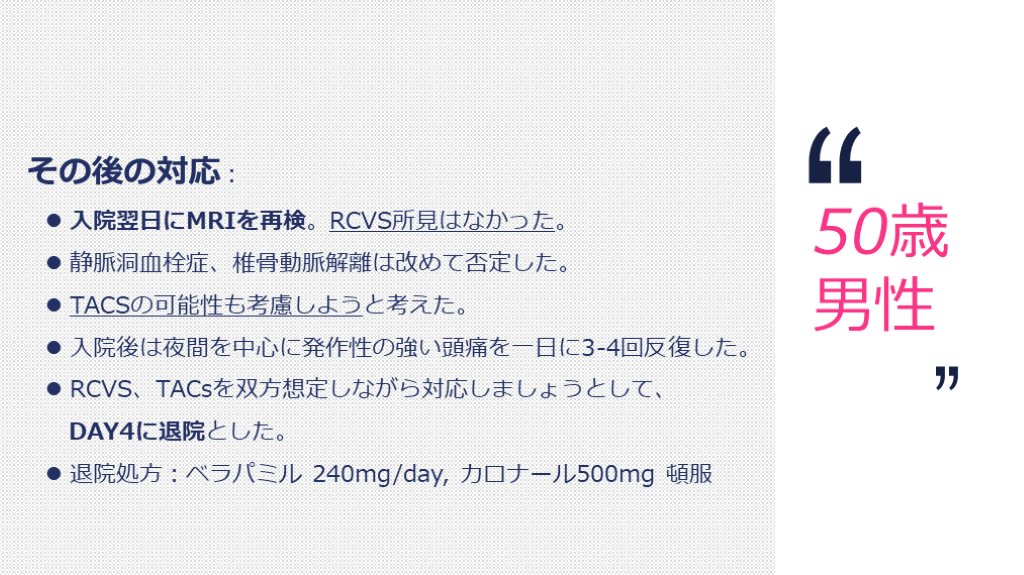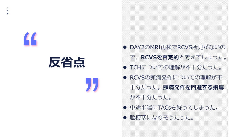 #63. 反省点 DAY2のMRI再検でRCVS所見がないので、RCVSを否定的と考えてしまった。
