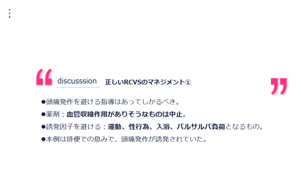 #66. discusssion 正しいRCVSのマネジメント① 頭痛発作を避ける指導はあってしかるべき。