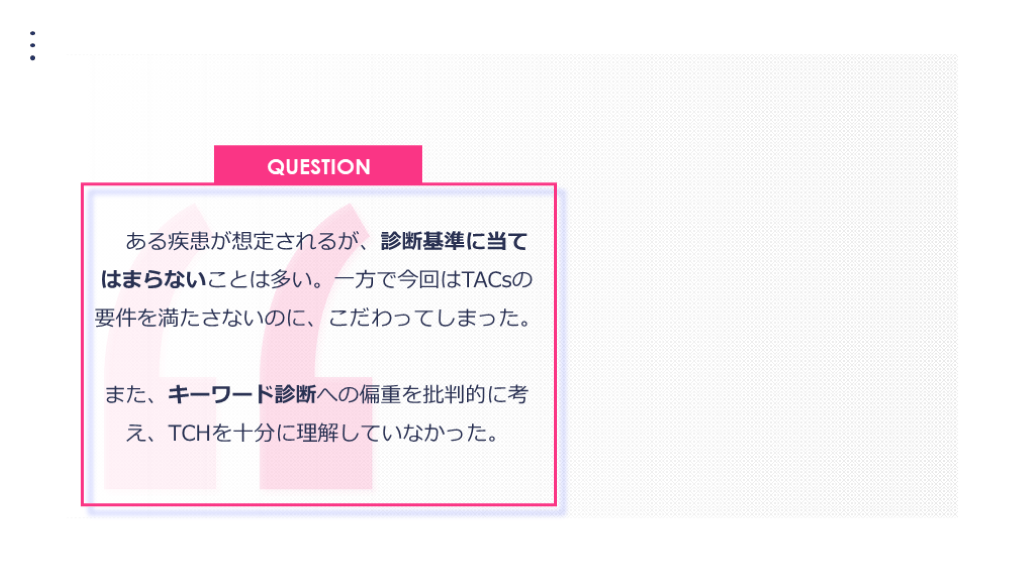 また、キーワード診断への偏重を批判的に考え、TCHを十分に理解していなかった。 QUESTION