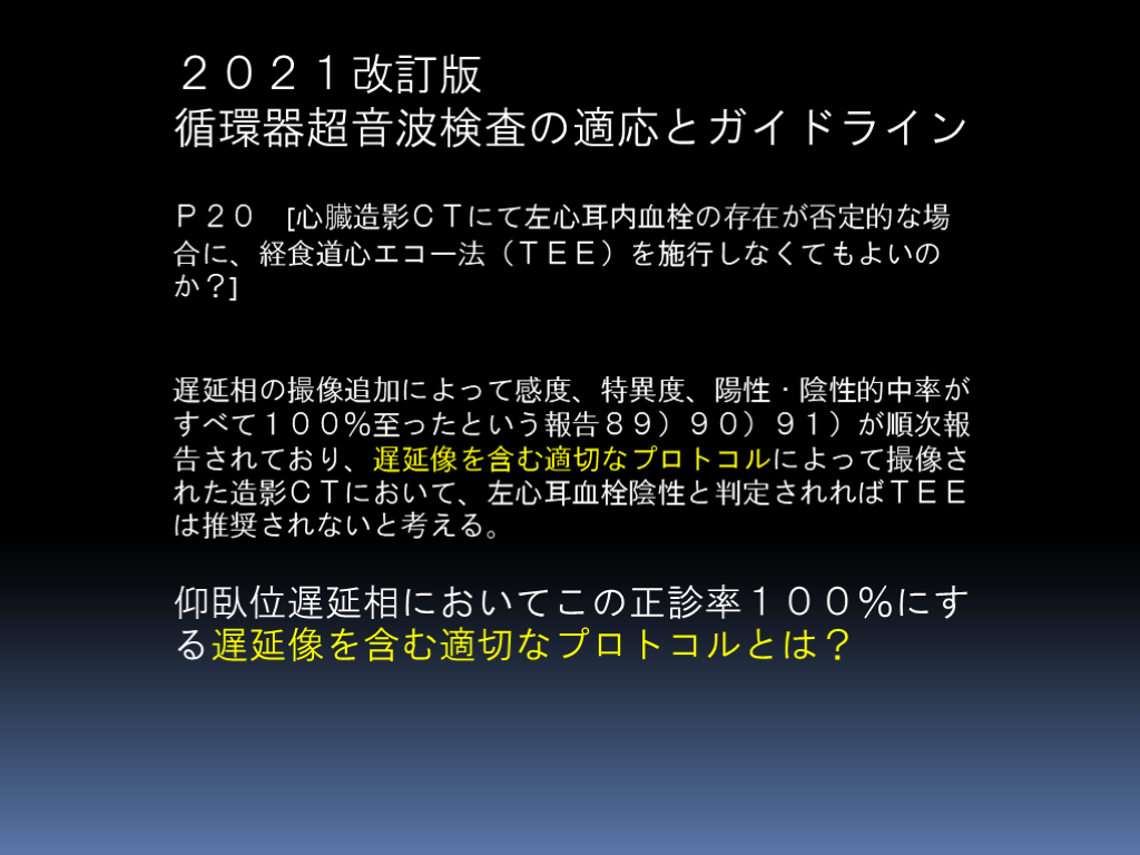 遅延相の撮像追加によって感度、特異度、陽性・陰性的中率がすべて100%至ったという報告89)90)91)が順次報告されており、遅延像を含む適切なプロトコルによって撮像された造影CTにおいて、左心耳血栓陰性と判定されればTEEは推奨されないと考える。