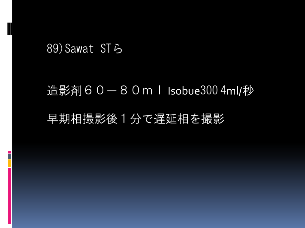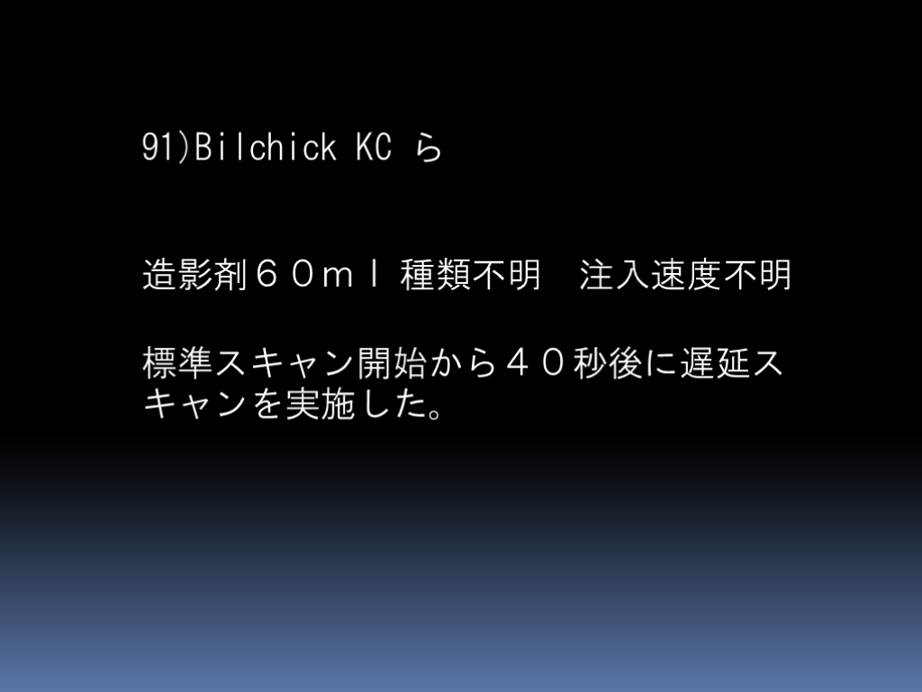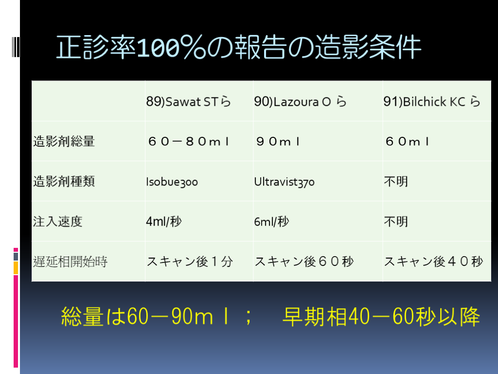 #8. 正診率100%の報告の造影条件 総量は60-90ml; 早期相40-60秒以降