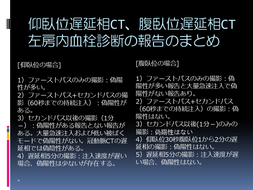 #10. 仰臥位遅延相CT、腹臥位遅延相CT左房内血栓診断の報告のまとめ [仰臥位の場合]1)ファーストパスのみの撮影:偽陽性が多い。2)ファーストパス+セカンドパスの撮影(60秒までの持続注入):偽陽性がある。3)セカンドパス以後の撮影(1分-):偽陽性がある報告とない報告がある。大量急速注入および低い被ばくモードで偽陽性がない。冠動脈CTの遅延相では偽陰性がある。4)遅延相5分の撮影:注入速度が遅い場合、偽陽性は少ないが存在する。。 [腹臥位の場合]1)ファーストパスのみの撮影:偽陽性が多い報告と大量急速注入で偽陽性がない報告あり。2)ファーストパス+セカンドパス(60秒までの持続注入)の撮影:偽陽性はない。3)セカンドパス以後(1分-)のみの撮影:偽陽性はない4)仰臥位30秒腹臥位1から2分の遅延相の撮影:偽陽性はない。5)遅延相5分の撮影:注入速度が遅い場合、偽陽性はない。
