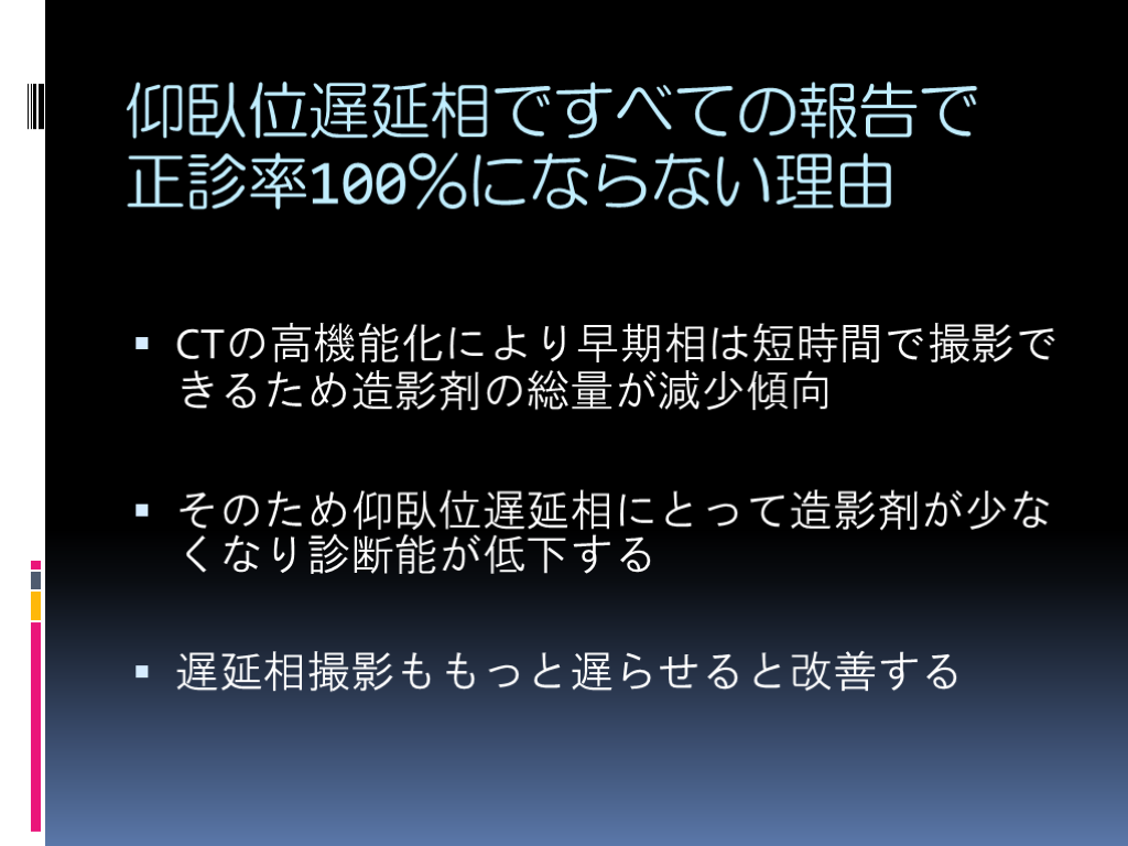 #11. 仰臥位遅延相ですべての報告で正診率100%にならない理由 CTの高機能化により早期相は短時間で撮影できるため造影剤の総量が減少傾向