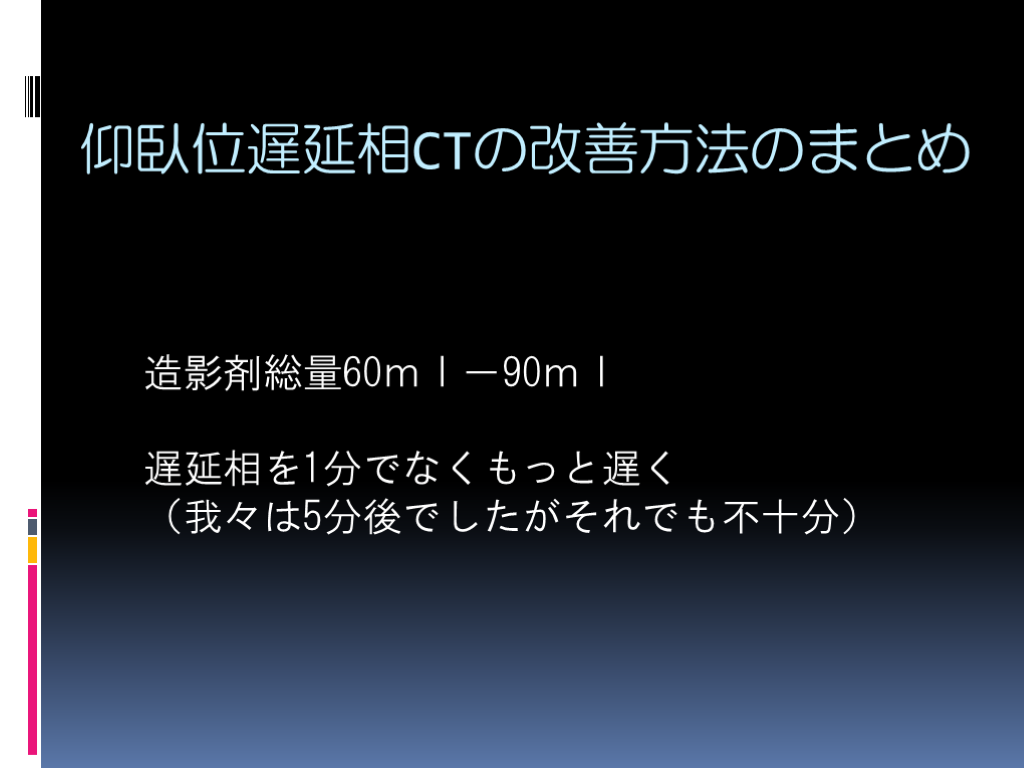 #12. 仰臥位遅延相CTの改善方法のまとめ 造影剤総量60ml-90ml
