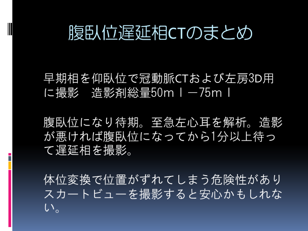 #13. 腹臥位遅延相CTのまとめ 早期相を仰臥位で冠動脈CTおよび左房3D用に撮影 造影剤総量50ml-75ml