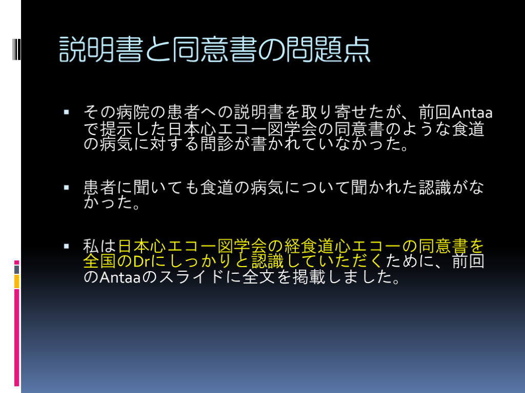 私は日本心エコー図学会の経食道心エコーの同意書を全国のDrにしっかりと認識していただくために、前回のAntaaのスライドに全文を掲載しました。