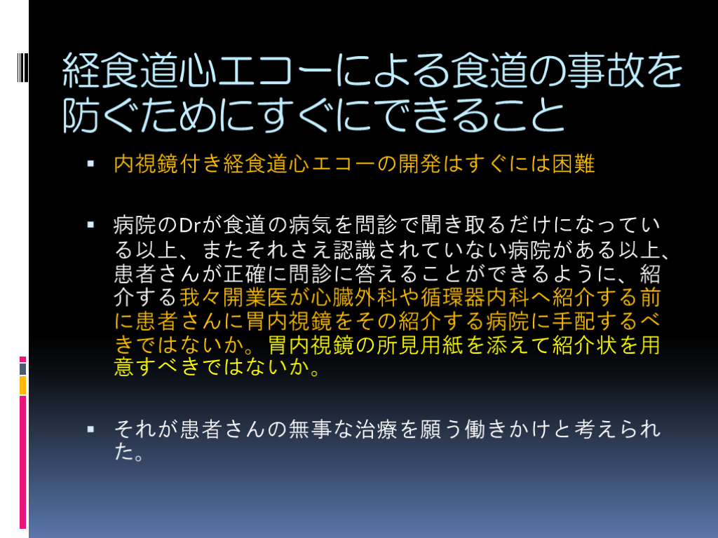 病院のDrが食道の病気を問診で聞き取るだけになっている以上、またそれさえ認識されていない病院がある以上、患者さんが正確に問診に答えることができるように、紹介する我々開業医が心臓外科や循環器内科へ紹介する前に患者さんに胃内視鏡をその紹介する病院に手配するべきではないか。胃内視鏡の所見用紙を添えて紹介状を用意すべきではないか。