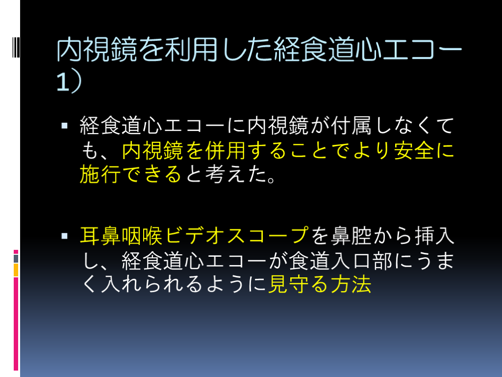 経食道心エコーに内視鏡が付属しなくても、内視鏡を併用することでより安全に施行できると考えた。