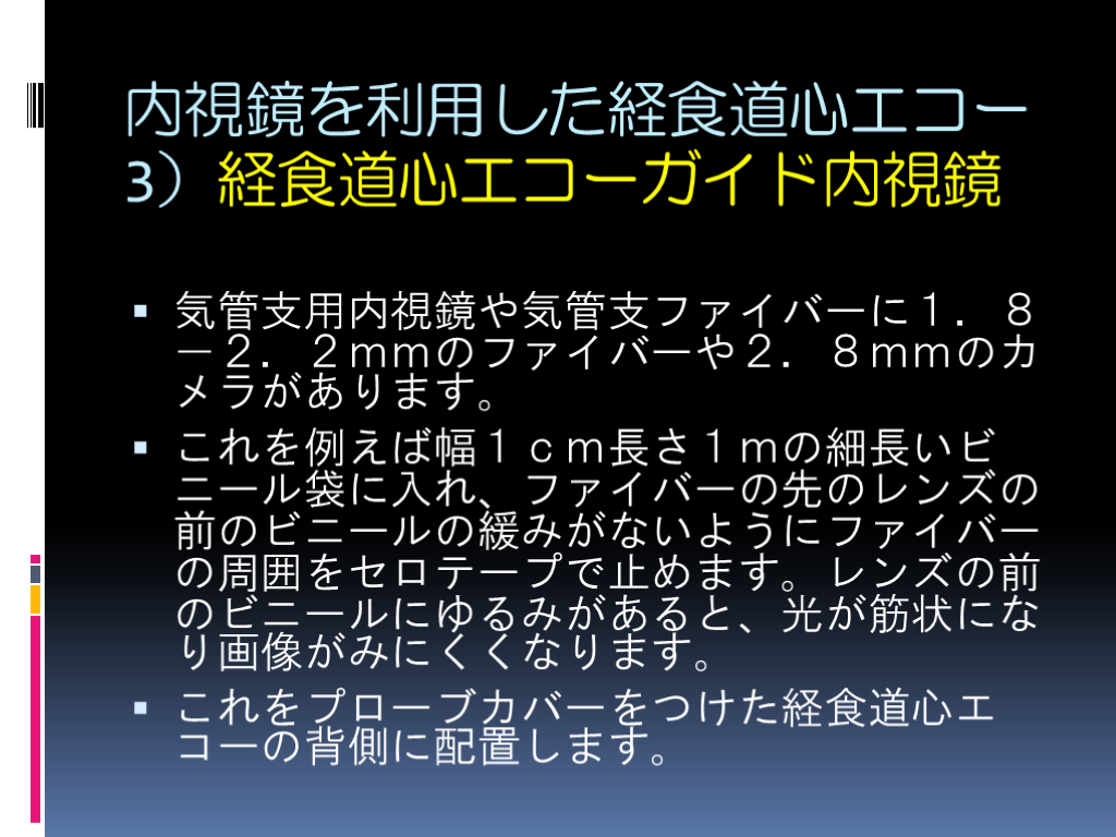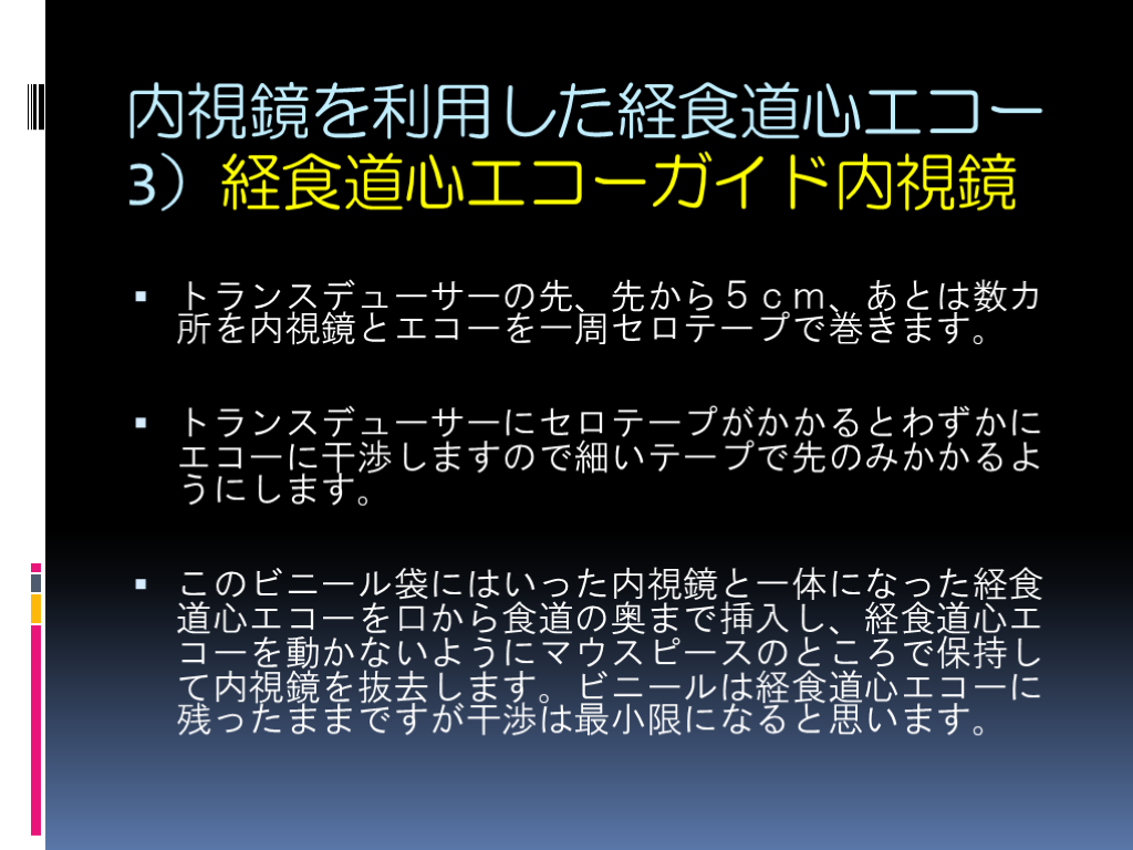 ビニール越しの画面でも盲目的な経食道心エコーよりは安全です。内視鏡の消毒が不要になります。