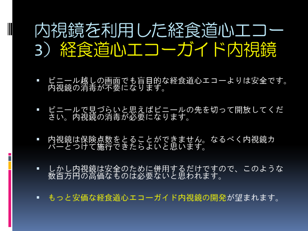 もっと安価な経食道心エコーガイド内視鏡の開発が望まれます。