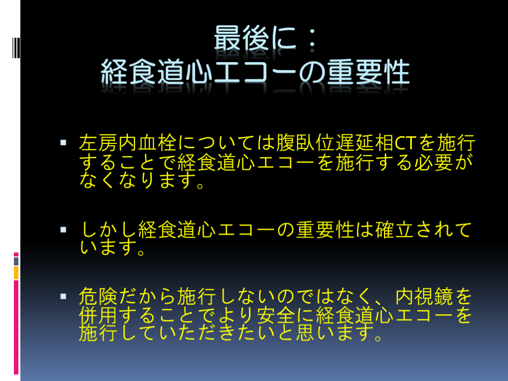 危険だから施行しないのではなく、内視鏡を併用することでより安全に経食道心エコーを施行していただきたいと思います。