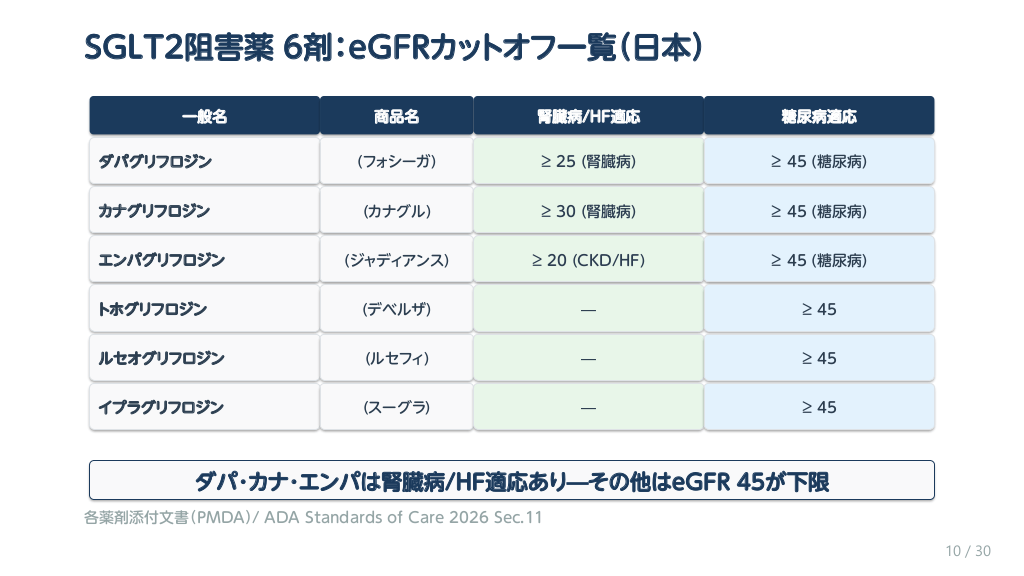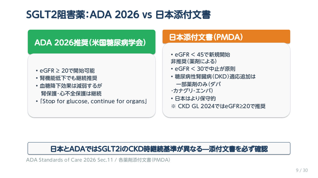#10. SGLT2阻害薬:ADA 2026 vs 日本添付文書 ADA 2026推奨(米国糖尿病学会) 日本添付文書(PMDA) • eGFR ≥ 20で開始可能 • 腎機能低下でも継続推奨 • 血糖降下効果は減弱するが 腎保護・心不全保護は継続 • 「Stop for glucose, continue for organs」 • eGFR < 45で新規開始 非推奨(薬剤による) • eGFR < 30で中止が原則 • 糖尿病性腎臓病(DKD)適応追加は 一部薬剤のみ(ダパ ・カナグリ・エンパ) • 日本はより保守的 ※ CKD GL 2024ではeGFR≥20で推奨 日本とADAではSGLT2iのCKD時継続基準が異なる—添付文書を必ず確認 ADA Standards of Care 2026 Sec.11 / 各薬剤添付文書(PMDA) 9 / 30